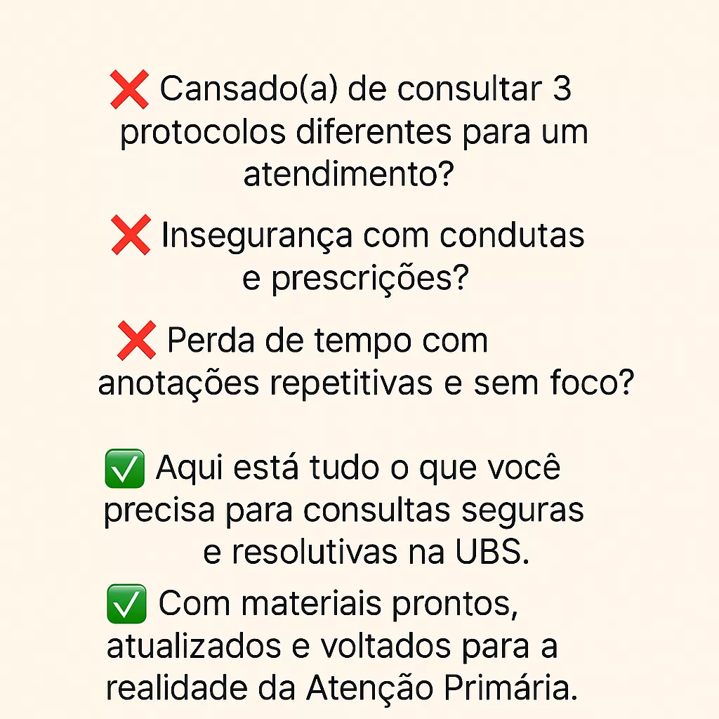 Foi desenvolvido por quem conhece de perto os desafios da rotina na APS — como a insegurança diante de tantos protocolos, a dificuldade em encontrar materiais organizados e a sobrecarga de uma rotina intensa.